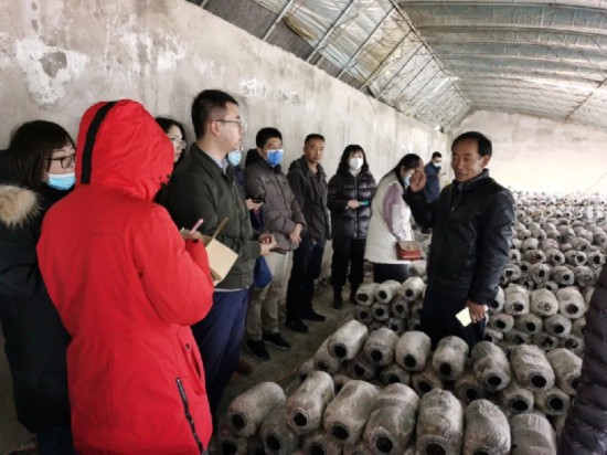 11月9日,青海行采访团记者们在海北州海晏县东达村标准化集中养殖场大棚里,听村支书牛生有介绍蘑菇养殖经验。