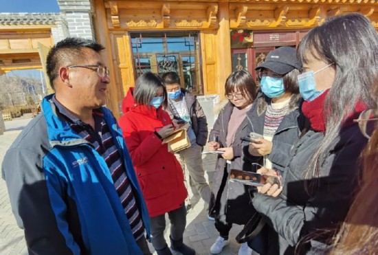 11月9日,青海行采访团记者们走进文迦牧场,采访负责人力杰群培。