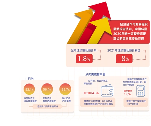 经合组织最新报告预测,中国将是2020年唯一实现经济正增长的世界主要经济体,全年经济增长预计为1.8%,2021年经济增长预计将达到8%。从长时段和世界范围来看,中国经济快速复苏具有十分重要的战略意义,不仅彰显了中国制度的显著优势,更重要的是为加快构建以国内大循环为主体、国内国际双循环相互促进的新发展格局创造了战略时机和坚实基础。