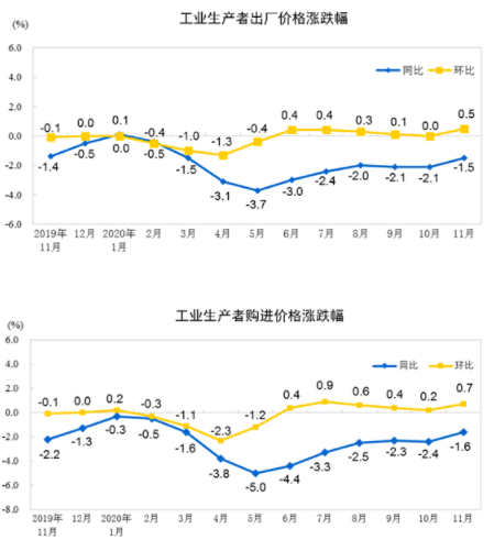 2020年11月份,全国工业生产者出厂价格(PPI)同比下降1.5%,环比上涨0.5%;工业生产者购进价格同比下降1.6%,环比上涨0.7%。1―11月平均,工业生产者出厂价格比去年同期下降2.0%,工业生产者购进价格下降2.5%。