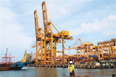 12月1日,中国港湾工程有限责任公司(中国港湾)承建的斯里兰卡科伦坡港贾亚码头扩建项目正式开工,预计工期20个月。图为一艘工程船(左)停泊在水面上。新华社记者 唐璐 摄
