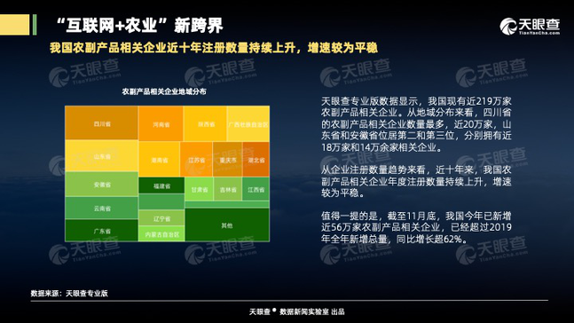 值得一提的是,截至11月底,以工商登记为准,我国今年已新增近56万家农副产品相关企业,已经超过2019年全年新增总量,同比增长超62%。