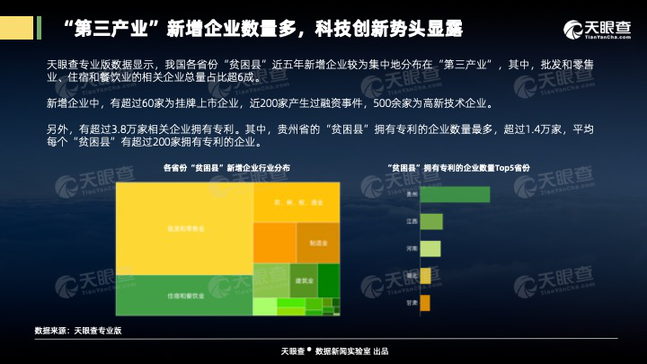 数据显示,我国各省份“贫困县”近五年新增企业较为集中地分布在“第三产业”,其中,批发和零售业、住宿和餐饮业的相关企业总量占比超6成。