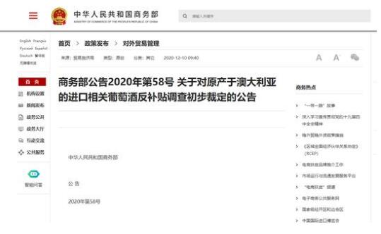 根据《中华人民共和国反补贴条例》(以下称《反补贴条例》)的规定,2020年8月31日,商务部(以下称调查机关)发布2020年第35号公告,决定对原产于澳大利亚的进口相关葡萄酒进行反补贴立案调查。