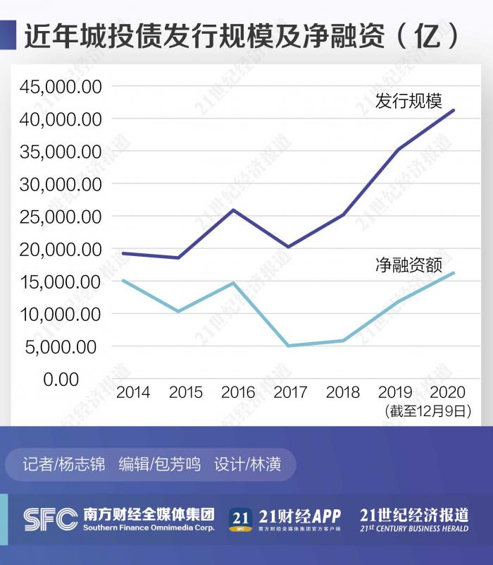 Wind数据显示,截至12月9日,今年城投债发行规模高达4.1万亿,净融资规模为1.6万亿,双双创出历史新高。在此之前,发行规模的峰值为2019年的3.5万亿,净融资峰值为2014年的1.5万亿。