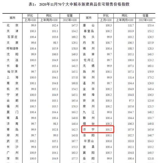 12月14日电 国家统计局14日公布70个大中城市住宅销售价格月度报告显示,11月份,70大中城市中有36城新建商品住宅价格环比上涨,10月为45城;环比看,济宁涨幅1.2%领跑,北上广深分别跌0.1%、持平、涨0.9%、持平。