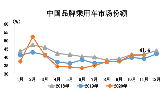 11月,中国品牌乘用车销量继续保持同环比双增的态势,当月共销售95万辆,环比微增1.26%,同比增长17.7%,占乘用车销售总量的41.4%,较上月提升0.2个百分点,比上年同期提升2.1个百分点。陈士华表示,中国品牌在今年疫情发生之后的几个月压力非常大,尤其尾部中国品牌乘用车企业面临着生存压力,同时有些企业在重整;近几个月,中国品牌乘用车恢复速度较快,10月和11月都超过了同期水平,但就全年情况来看,仍然面临非常大的压力。