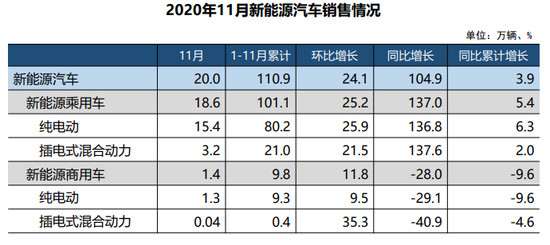 11月,新能源汽车产销分别完成19.8万辆和20万辆,同比分别增长75.1%和104.9%,其单月产销第5次刷新了当月历史记录。其中纯电动汽车产销分别完成16.4万辆和16.7万辆,同比分别增长66.2%和100.5%;插电式混合动力汽车产销均完成3.3万辆,同比分别增长136.4%和128.9%;燃料电池汽车产销分别完成288辆和290辆,同比分别增长7.2倍和28倍。