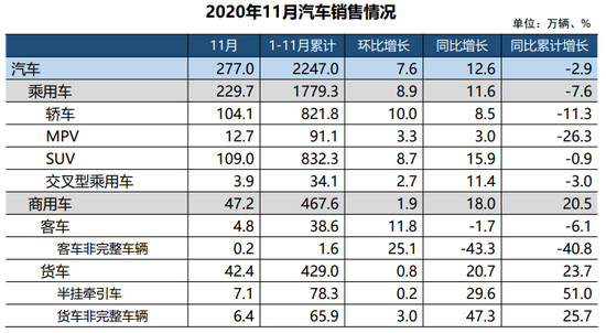 中汽协副秘书长陈士华表示,11月国家扩大内需战略以及各项促进消费政策持续发力,国内统筹推进疫情防控和经济社会发展工作取得了明显成效,工业生产稳中有升、需求基本回暖、就业形势持续改善,物价平稳、市场预期向好,国民经济运行延续稳定恢复态势。在此背景下,汽车产销继续呈现同比较快增长态势,行业形势呈现稳中有进的发展态势。