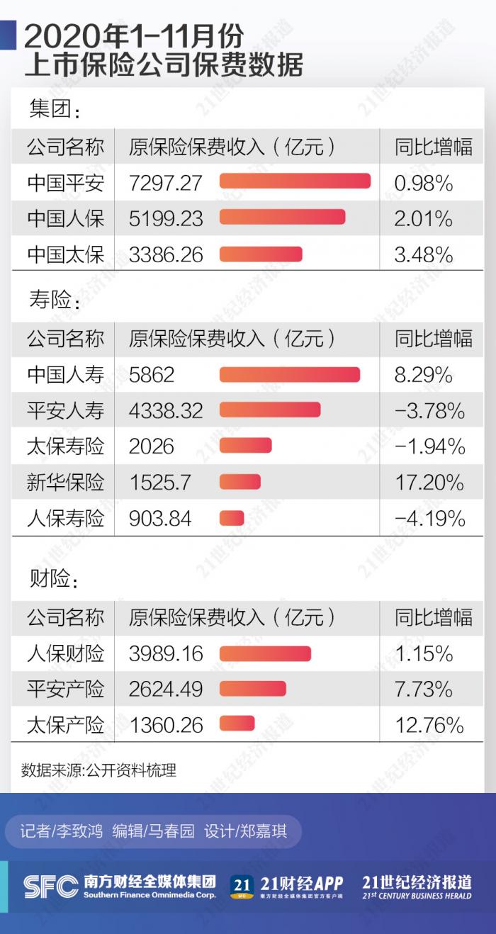具体而言,从集团层面看,1-11月,中国平安原保险保费收入7297.27亿元,同比增长0.98%;中国人保原保险保费收入5199.23亿元,同比增长2.01%;中国太保原保险保费收入3386.26亿元,同比增长3.48%。