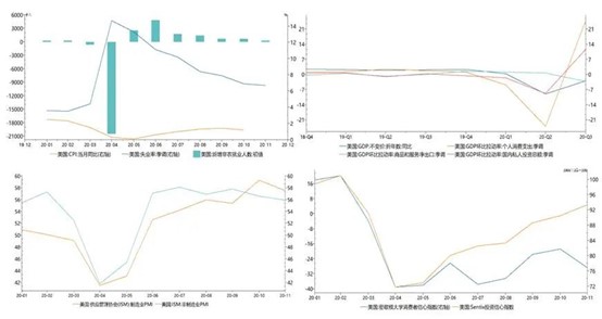 美国11月制造业PMI小幅回落至57.5,前值59.3。服务业PMI在9月小幅上升后10月、11月持续下降,11月为55.9。11月份消费者信心指数回落到76.9,前值为81.8,目前仍远低于疫情前水平。Sentix投资者信心指数持续回升,11月数值为4.8,11月数值重回正区间,但仍处于历史低位。美国消费者物价指数同比在5月触底后开始逐步恢复,10月数值1.2%,前值1.4%,增速有所放缓,显示出经济仍较疲软。美国经济整体呈温和复苏状态。