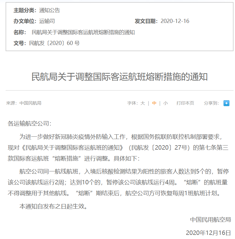 12月6日,民航局发布通知称, 现对《民航局关于调整国际客运航班的通知》的第七条第三款国际客运航班“熔断措施”进行调整。航空公司同一航线航班,入境后核酸检测结果为阳性的旅客人数达到5个的,暂停该公司该航线运行2周;达到10个的,暂停该公司该航线运行4周。“熔断”的航班量不得调整用于其他航线。“熔断”期结束后,航空公司方可恢复每周1班航班计划。
