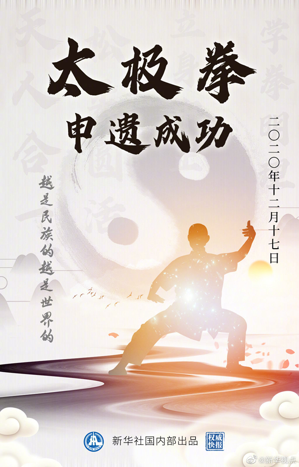 据介绍,太极拳自17世纪中叶形成以来,世代传承,习练者遍布全国各地,并在海外有着广泛传播和传承。太极拳对于习练者的性别、年龄、体质、职业、民族没有限制,通过习练太极拳,人们在修身养性、强身健体的同时,也传承着中华民族的文化基因。“学拳明理”,太极拳所蕴含的阴阳循环、天人合一的中国传统哲学思想和养生观念,丰富着人们对宇宙、自然和人体运行规律的认知;其松柔圆活与立身中正的基本要求,尊师重道、学拳不可不敬、不可狂、不可满等价值观念,潜移默化地涵养着人们平和、包容、友善的心性。在提升人民群众健康意识、促进身心健康、推动人与人和谐共处、增强社会凝聚力等方面,太极拳都发挥着重要作用。