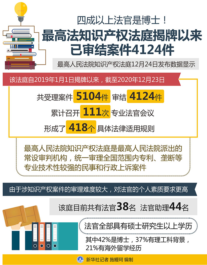 新华社北京12月24日电(记者刘硕、罗沙)最高人民法院知识产权法庭24日发布数据显示,该法庭自2019年1月1日揭牌以来,截至2020年12月23日,共受理案件5104件,审结4124件。累计召开111次专业法官会议,形成了418个具体法律适用规则。