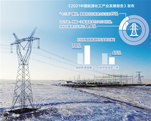 报告预计,2025年,我国一次能源需求约54亿吨标煤。其中,化石能源占比约81.2%,比“十三五”末降低3.1个百分点,煤炭占比将下降5.4个百分点至51%,仅天然气占比有所提升。非化石能源占比将持续提升,达18.8%,单位GDP能耗将比2020年再降低约17%。