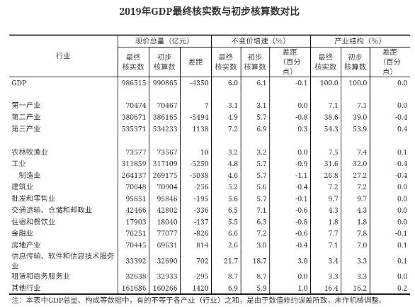 北京12月30日讯 国家统计局网站今日发布数据,经最终核实,2019年,GDP现价总量为986515亿元,比初步核算数减少了4350亿元;按不变价格计算,比上年增长6.0%,比初步核算数下降0.1个百分点。