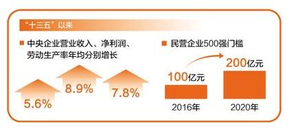 国企规模实力持续增强,效益稳步提高。预计到今年底,中央企业资产总额将接近69万亿元,比“十二五”末增长45%。“十三五”以来,中央企业营业收入、净利润、劳动生产率年均分别增长5.6%、8.9%、7.8%,进入世界500强的中央企业达到48家。民企改革发展成效显著。“十三五”以来,民营企业500强门槛从2016年的100亿元提升至2020年的200亿元;创新创业创造热情高涨,中小企业数量增长近1倍。
