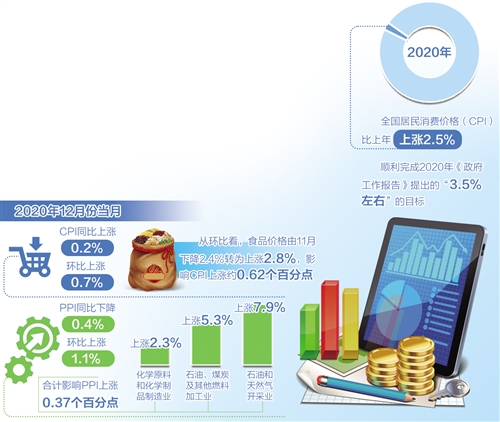 国家统计局1月11日发布的数据显示,2020年全年,全国居民消费价格(CPI)比上年上涨2.5%,同比涨幅连续第三年保持在“2区间”,顺利完成2020年《政府工作报告》提出的“3.5%左右”的目标。2020年全年,工业生产者出厂价格(PPI)比上年下降1.8%;12月当月,CPI同比上涨0.2%,环比上涨0.7%;PPI同比下降0.4%,环比上涨1.1%。