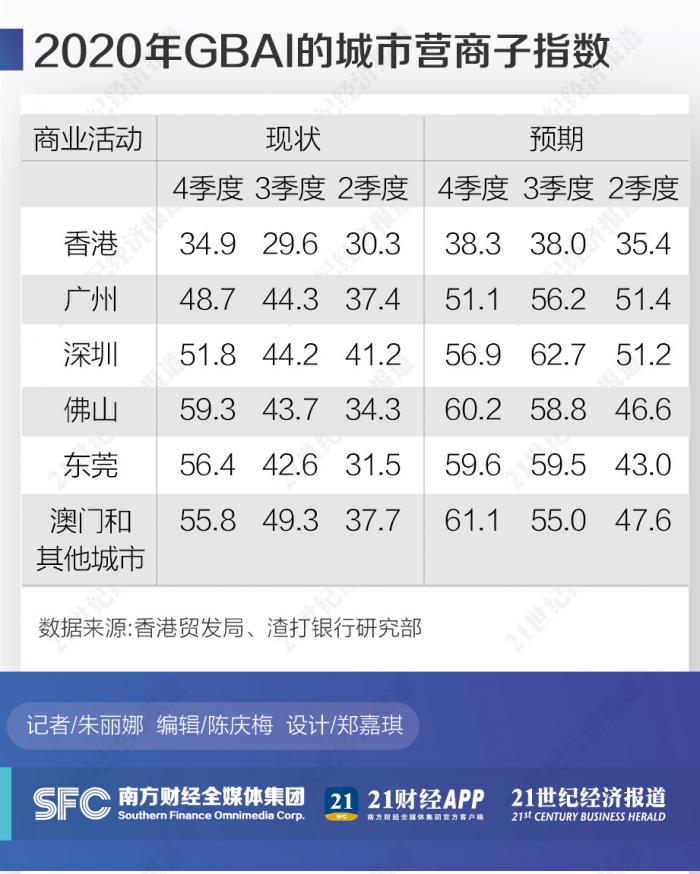 最新的调查显示,大湾区内核心城市的辐射效应不断加强,非核心城市正在逐渐崭露头角。2020年第四季度所有城市商业活动现状子指数均比上一季度有所改善,涨幅最高的是非核心城市。其中,佛山和东莞环比分别上升15.6个百分点和13.8个百分点,而深圳和广州则分别上升7.6个百分点和4.4个百分点。