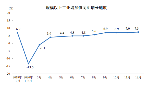 12月份,规模以上工业增加值同比实际增长7.3%(以下增加值增速均为扣除价格因素的实际增长率),增速较11月份加快0.3个百分点。从环比看,12月份,规模以上工业增加值比上月增长1.10%。2020年,规模以上工业增加值比上年增长2.8%。