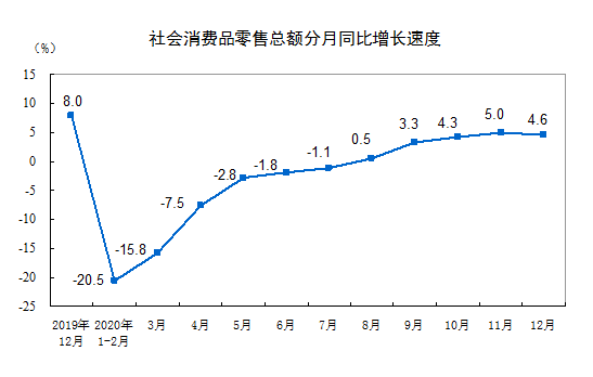 随着我国经济运行稳步恢复,消费对经济增长的拉动力度逐季回升。四季度,社会消费品零售总额同比增长4.6%,增速比三季度加快了3.7个百分点;最终消费增长拉动经济增长2.6个百分点,比三季度多1.2个百分点。随着疫情进一步得到有效控制,消费需求的动力也将进一步恢复。