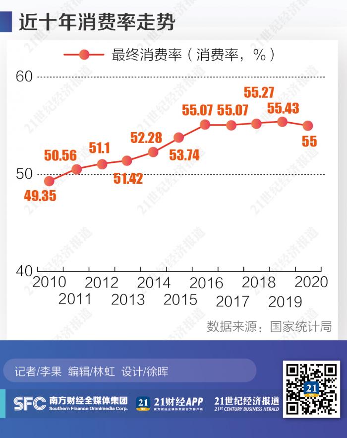 具体看,2020年最终消费率接近55%,2011-2019年,我国的消费率平均为53.4%,2020年尽管受到新冠肺炎疫情的冲击,但最终消费支出占GDP的比重仍然达到54.3%,高于资本形成总额11.2个百分点,为近年来的最高水平。