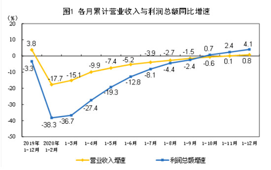 国家统计局工业司高级统计师朱虹表示,分季度看,2020年规模以上工业企业利润呈现“由负转正、逐季加快”的走势。受疫情影响,一季度利润同比大幅下降36.7%,随着“六稳”“六保”任务不断落实落细,企业复工复产水平稳步提升,二季度利润增长4.8%,增速实现由负转正,三季度增速回升至15.9%,四季度进一步加速至20.8%。