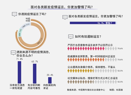 上周,中国青年报社社会调查中心联合问卷网(wenjuan.com),对1530名受访者进行的一项调查显示,72.2%的受访者遇到过疫情谣言。96.7%的受访者面对各类新发的疫情谣言更加警惕了。当遇到来源不明的疫情消息,71.8%的受访者表示没有官方消息一律先观望。