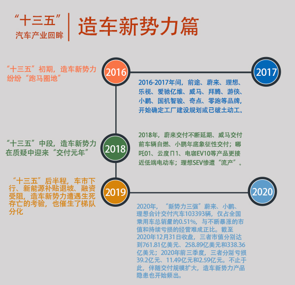 回顾历史,“十三五”开局,造车新势力纷纷“跑马圈地”。2016-2017年间,前途汽车苏州基地破土动工,蔚来确定首款车型生产落户江淮,理想汽车常熟工厂奠基,爱驰亿维生产基地落户上饶,威马温州生产基地奠基,拜腾宣布在南京建设工厂,游侠汽车确定首个生产基地将落户湖州,小鹏汽车宣布生产基地将在肇庆市建设,国机智骏赣州生产基地奠基,奇点汽车铜陵基地开工建设;零跑汽车金华工厂开建……