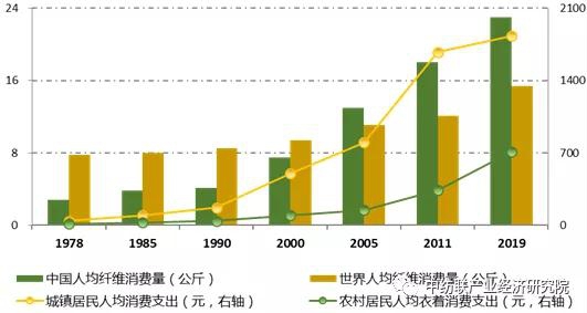 图3:世界及我国人均纤维消费量、城乡居民人均衣着消费支出情况