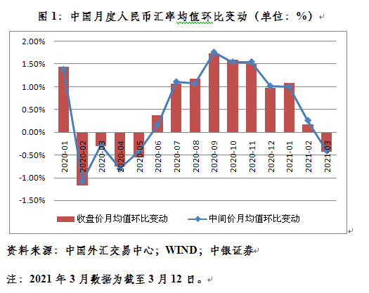 实际情况是,新年头两个交易日,人民币汇率应声升破6.50。但1月6日至2月底,在6.43~6.50区间窄幅盘整。1月份,中间价和收盘价均值环比继续上涨1%,2月份只涨了0.2%(见图1),显示人民币做多动能逐渐衰减。