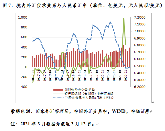 3月初至12日,境内银行间市场即期询价交易日均成交量为393亿美元,较前2个月日均成交量增长13%。其中,3月5至10日人民币跌破6.50,同期即期询价交易每日成交400亿以上,日均成交量451亿美元,刷新了去年12月份日均成交量439亿美元的纪录(见图7)。3月12日,人民币汇率又跌破6.50,当日外汇成交量为416亿美元,环比增长13%。这应该是同期美指连续升破91和92,人民币跟随下跌却盘间剧烈震荡的重要原因。