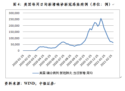 目前,美国已接种疫苗9000多万剂,接种比例超过27%,每周日均新确诊感染病例约为6万例,较年初高峰时的每周日均25万多例下降了七成半(见图4)。据经合组织(OECD)最新预测,去年美国经济衰退3.5%,今年预期增长6.5%,欧元区分别为-6.8%和3.9%,英国分别为-9.9%和5.1%,日本分别为-4.8%和2.7%。
