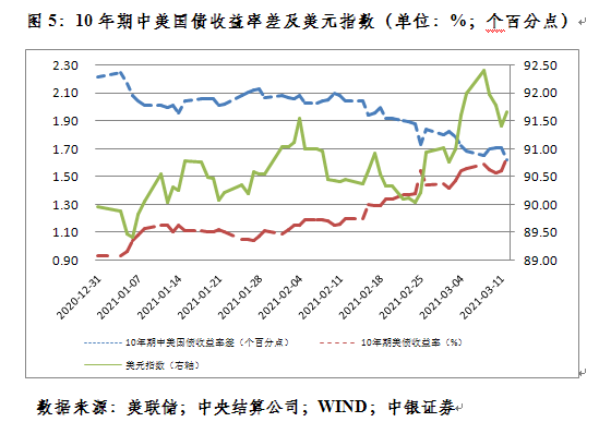 新年伊始,10年期美债收益率逐月攀升,到3月12日已从上年底的不到1%升破1.6%,较上年底反弹了76%,导致10年期中美国债收益率差收敛了59个基点。同期,美元指数先抑后扬,累计涨了1.9%,最多涨了2.7%(见图5)。