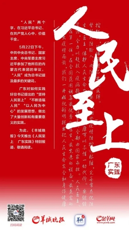 2020年全国“两会”,羊城晚报社推出“决战决胜2020——全国两会特别报道”,开启全新报道模式,集纳网络、视频、文字等报道形式,精心策划推出主题鲜明的“云报道”,立体展现代表委员的履职风采;精心策划京粤空中连线“云访谈”,即时连线等方式,跨越千里访谈;精心打造“云呈现”新闻产品,以Vlog、H5等方式,创新新闻产品呈现形式。2020年推出的H5产品《人民至上 广东实践》,集纳总书记以“人民”为关键词的“两会金句”,相关内容受到广泛关注、在全社会引起热烈反响。
