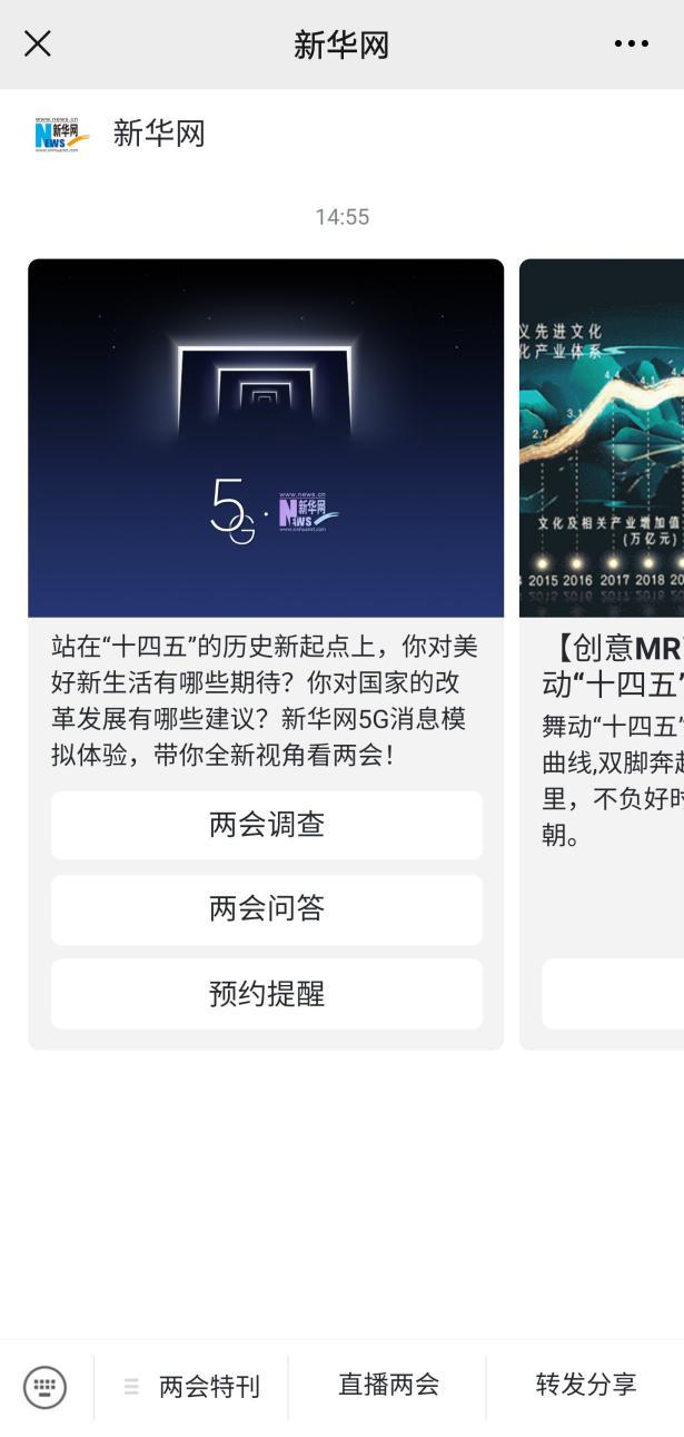 “短信小程序+5G”,超前布局、抢占先机 3月3日,新华网与中国移动联合推出“全国两会5G消息模拟体验”产品。作为新华网发布《传媒行业应用5G消息业务总体技术要求》后推出的首款5G前沿应用,产品把握5G高速率、大容量、低时延、高可靠传播特性,将先进通信技术与全媒体优质内容有机融合,为用户提供更高品质、更多彩的信息消费服务和更优越的阅看体验,有力抢得5G媒体应用先机。 产品开创全新应用场景,免去打开页面、下载软件、注册帐号、加关注等操作,全面颠覆用户对短信功能的想象,为用户建立起可以直接触达的信息通道,一键触达新闻现场。产品包含文字、图片、海报、音视频、动画、H5等富媒体内容,为用户提供一站式浏览解决方案,打开应用场景就可全面充分了解两会信息。同时,用户还可以在产品板块中直接参与调查、问答等在线交互,并可通过“转发分享”展示阅看喜好,提升用户体验效果。截至目前已发布稿件110余条,用户反响良好。