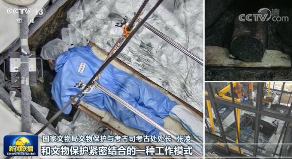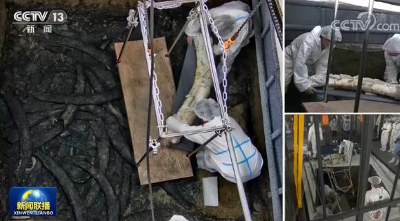这个神秘的木箱长约1.5米、宽约0.4米,至今未发现盖板,整体碳化,质地非常脆弱。同时,本次考古中发现的最大体量青铜尊今天也成功提取。3号坑大口尊连同内部填土重达几百公斤,在穿上考古队为它量身3D打印的“保护箱”,利用新开发的文物起吊设备成功提取出土。此次发掘,考古队已经发现了近200枚象牙。专家介绍,出土象牙由于已经埋藏于高湿度的土壤中达3000多年,且在埋藏之前或经历焚烧,提取与保护难度极大。今天,考古人员利用高分子材料加固技术将一根象牙成功提取,并立即送往文物保护修复中心。