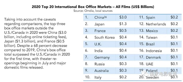 2020年,中国成为了全球第一大电影市场。除北美之外,全球票房前三名分别为:中国(30亿美元),日本(13亿美元)和法国(5亿美元)。其他国家和地区票房数据见下图: