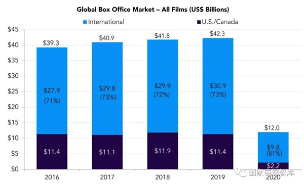 3月22日讯 记者从国家电影智库获悉,2021年3月18日,美国电影协会(MPAA)发布了最新报告《2020年影院和家庭娱乐市场环境报告》(THEME REPORT)。报告显示,受新冠肺炎疫情影响,2020年全球电影票房总额为120亿美元,同比下降近70%。北美票房为22亿美元,同比下跌80%。
