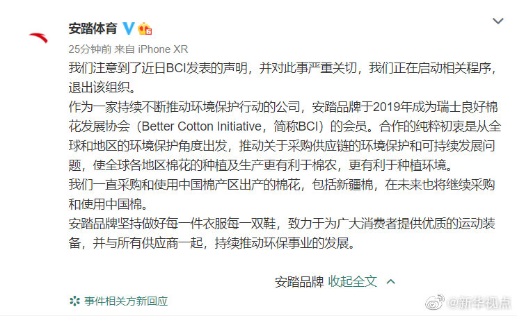 安踏体育在声明中说,安踏品牌于2019年成为瑞士良好棉花发展协会(BCI)的会员,合作的纯粹初衷是从全球和地区的环境保护角度出发。他们注意到了近日BCI发表的声明,并对此事严重关切。