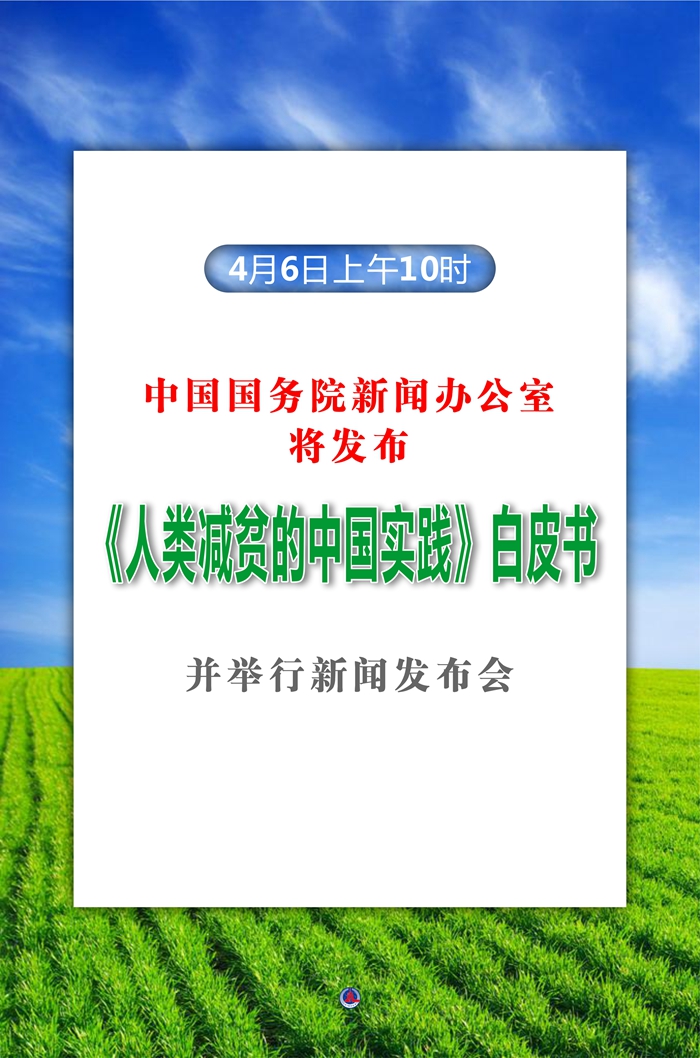 4月6日上午10时,中国国务院新闻办公室将发布《人类减贫的中国实践》白皮书,并举行新闻发布会。