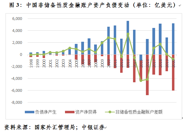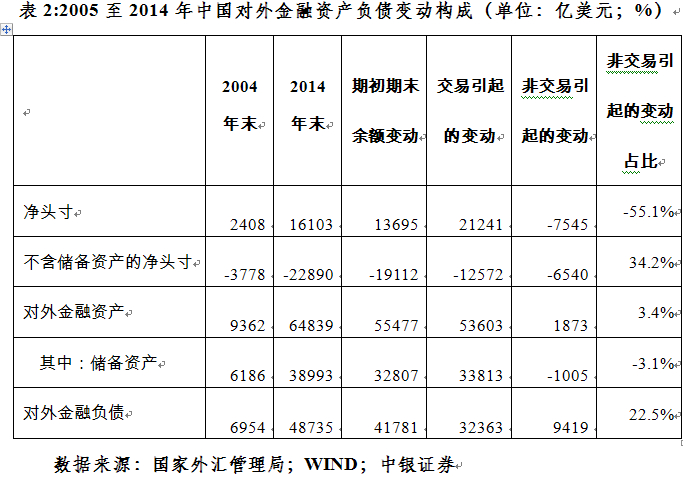 注:(1)交易引起的变动中,资产方交易数据为国际收支平衡表对应项的负值,代表境内对外投资增加;(2)非交易引起的变动=期间余额变动-交易引起的变动;(3)非交易变动占比=非交易引起的变动/期间余额变动;(4)不含储备资产的净头寸=净头寸-储备资产。