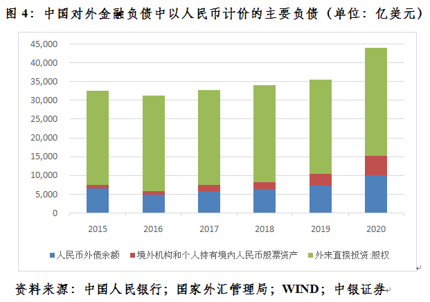 之所以非交易引起的对外负债增记较多,主要是因为去年人民币对美元汇率中间价升值6.9%,这导致对外负债中以人民币计值的部分折合美元数增加。据估算,去年我国人民币外债余额、境外机构和个人持有境内人民币股票资产余额,以及外来直接投资股权投资余额等三个部分,因人民币升值带来对外负债增记约合2754亿美元(用2019年末与2020年末余额算数平均值乘以2020年人民币汇率升值幅度),贡献了当期非交易引起的对外负债增记额的57%。