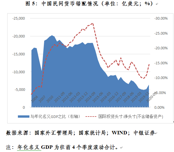 2015年“8·11”汇改之初,我国经历了资本外流、储备下降、汇率贬值,主要是因为1994年初汇率并轨至2014年底之前,人民币汇率持续单边升值。尤其是2005年“7·21”汇改以来,市场主体单向的“资产本币化、负债美元化”的财务操作,产生了较为严重的货币错配。到2014年末,民间对外净负债2.29万亿美元,较2004年末增加了1.91万亿美元。其中,1.26万亿美元来自非储备性质金融账户的累计顺差,6540亿美元来自非交易引起的变动,分别贡献了2005至2014年对外净资产增加额的66%和34%。