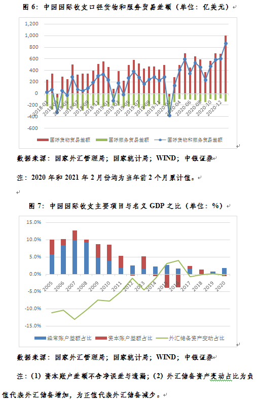 与2008年全球金融危机相比,这次公共卫生危机应对,虽然主要经济体财政货币刺激力度空前,但持续时间较短,迄今对我国对外经济部门的脆弱性影响有限。一方面,尽管民间对外净负债规模及占比均有所上升,但到去年底,民间对外净负债与名义GDP之比仍仅有7.7%,甚至还低于2019年“破7”前夕1.1个百分点。与2013年“缩减恐慌”之时,我国该比例高达20%多相比,更是不可同日而语。另一方面,由于疫情先进先出,我国率先复工复产,有望保持经常项目盈余较大的优势。今年前2个月,国际收支口径的货物和服务顺差合计865亿美元,去年同期为逆差377亿美元。除外贸进出口“开门红”、由逆差转为顺差外,服务逆差较上年同期进一步收敛58%,其中旅游收支同步下降,旅游逆差减少136亿美元,贡献了同期服务逆差降幅的72%。鉴于我国通过疫苗接种达到群体免疫时间比较靠后,这意味着我国跨境人员往来解封将会较迟,服务逆差有可能继续收敛,支持我国维持较大规模经常项目盈余。这种外汇现金流将为我国抵御外部冲击提供较厚的安全垫。