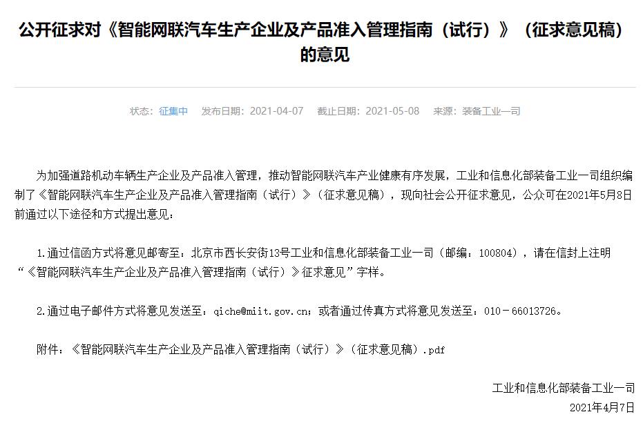 北京4月7日讯 据工信部今日发布消息,为加强道路机动车辆生产企业及产品准入管理,推动智能网联汽车产业健康有序发展,工业和信息化部装备工业一司组织编制了《智能网联汽车生产企业及产品准入管理指南(试行)》(征求意见稿),现向社会公开征求意见。