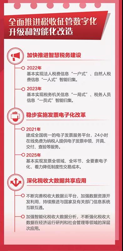 “十四五”开局,进一步深化税收征管改革势在必行。《意见》对深入推进精确执法、精细服务、精准监管、精诚共治,深化税收征管改革作出全面部署,并明确改革时间表: