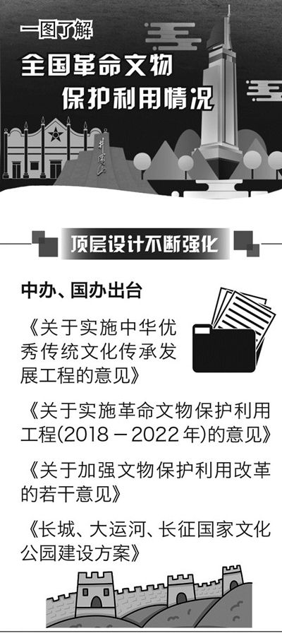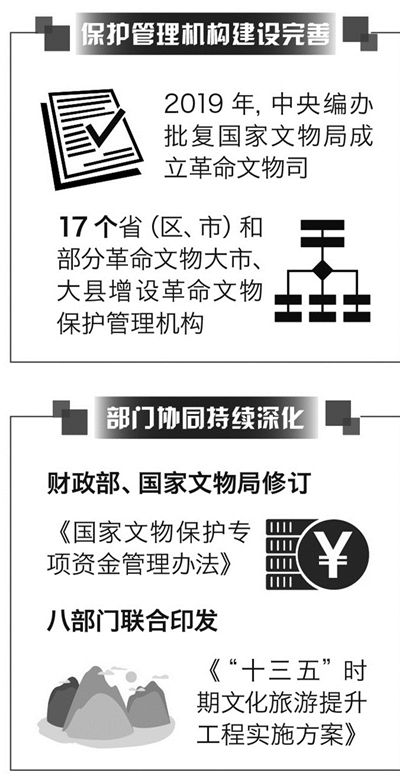 2017年1月,中办、国办出台《关于实施中华优秀传统文化传承发展工程的意见》,此后《关于实施革命文物保护利用工程(2018-2022年)的意见》《关于加强文物保护利用改革的若干意见》《长城、大运河、长征国家文化公园建设方案》陆续出台,进一步规范了新时代革命文物相关工作;2017年2月,《“十三五”时期文化旅游提升工程实施方案》印发,加大支持革命文物保护利用设施建设和红色旅游基础设施建设力度;2019年,财政部、国家文物局修订《国家文物保护专项资金管理办法》,对革命老区和革命文物保护予以倾斜;2020年,中宣部、财政部、文化和旅游部、国家文物局公布两批37个革命文物保护利用片区……