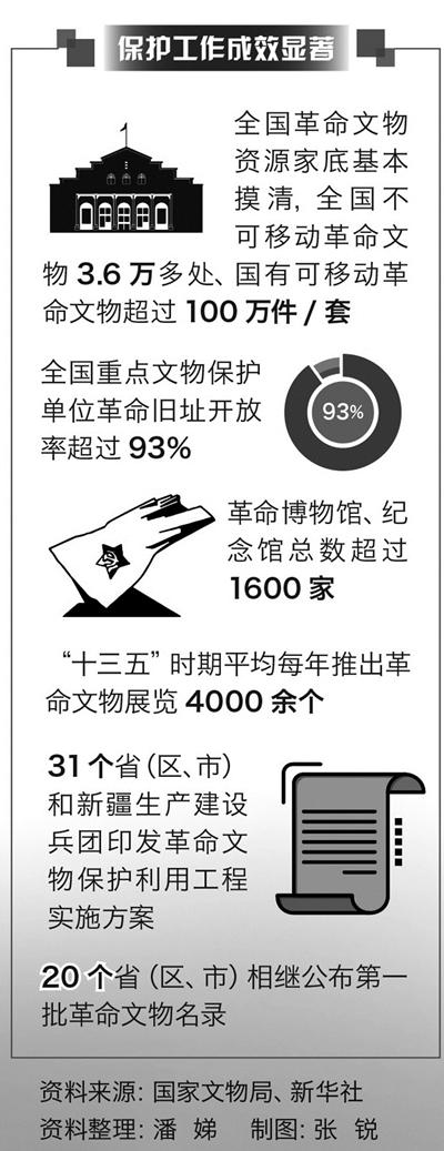 在各方共同努力下,我国革命文物资源“家底”基本摸清。国家文物局近日公布,全国不可移动革命文物3.6万多处,国有馆藏可移动革命文物超过100万件/套。20个省(区、市)相继公布第一批革命文物名录,革命文物史实研究和价值挖掘不断深入,保护管理状况显著改善。“十三五”时期国家文物局共实施263项全国重点文物保护单位革命文物保护项目,2021年已批复近200项。
