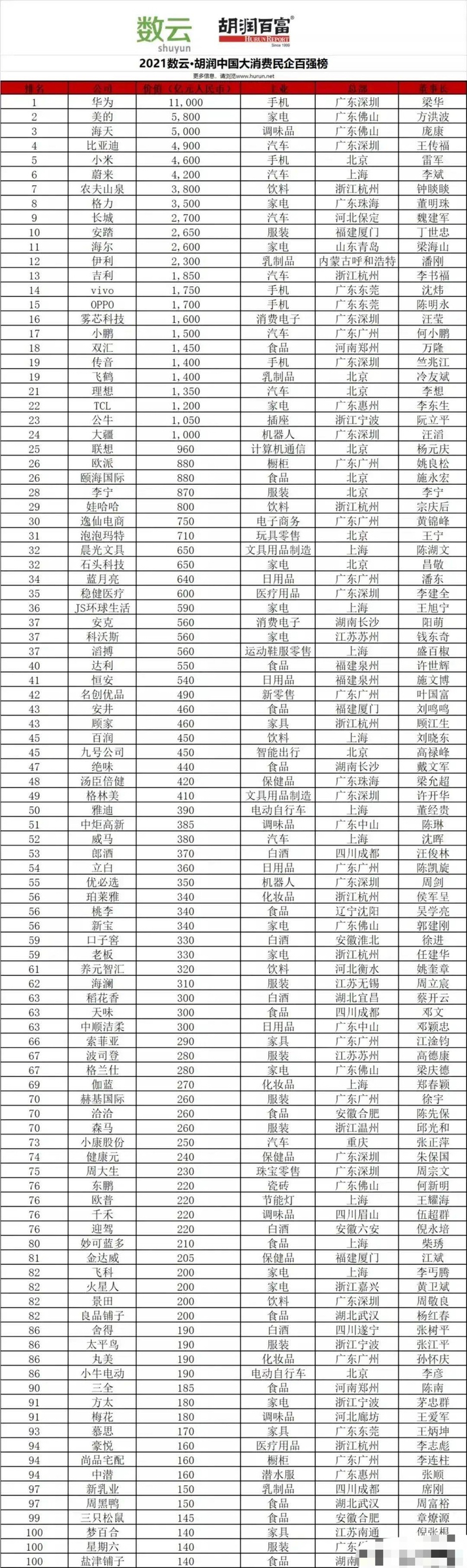 华为是大消费民企百强榜第一,价值1.1万亿,相当于第二名美的第三名海天的总和。华为手机作为华为三大核心业务之一,华为的出货量超过苹果手机,跃居全球第二位。华为手机超高的颜值和逆天的拍照功能收割了一大票用户,而高性能更是让这部手机的好感度蹭蹭上涨。
